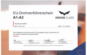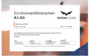 Am 18. Juni 2025 habe ich den Drohnenführerschein A1-A3 mit Erfolg bestanden. Die Vorberreitungen für den Drohnenführerschein A2 laufen auf Hochturen.